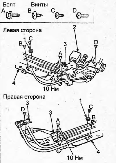 3. Отверните винты, затем снимите стопоры и задние кронштейны. Отверните болты от боковых кронштейнов и отверните винты от подрамника люка.