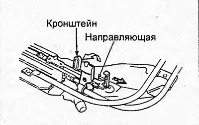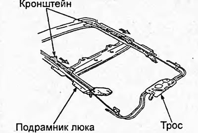 8. Сдвиньте трос привода люка вместе с кронштейнами назад и отсоедините его от подрамника люка.