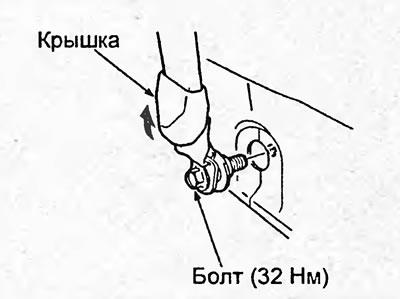 4. Поднимите вверх крышку болта нижнего крепления ремня безопасности переднего сиденья, как показано на рисунке, и отверните болт.
