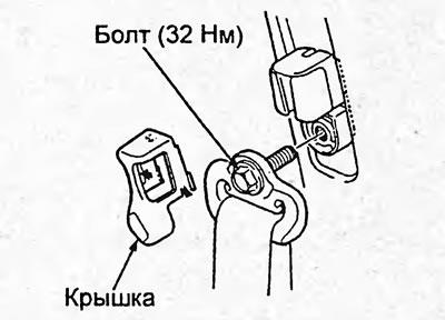 6. Снимите крышку болта верхнего крепления ремня безопасности переднего сиденья, как показано на рисунке, и отверните болт.