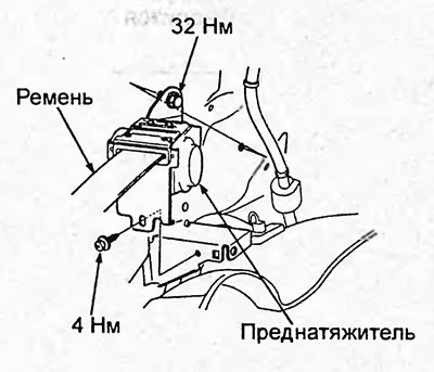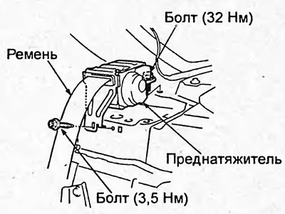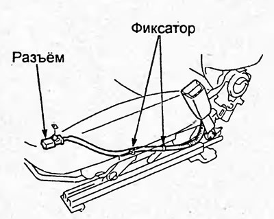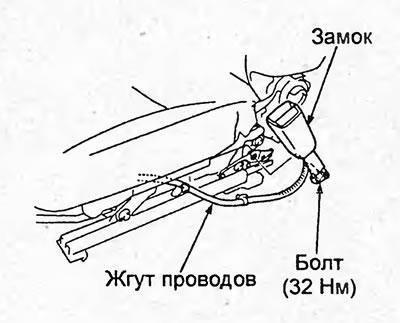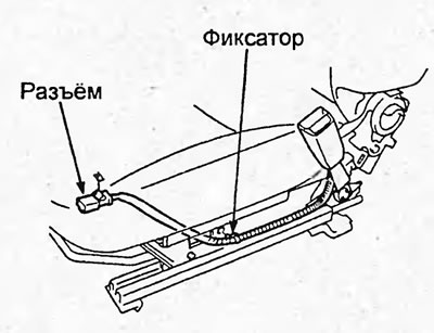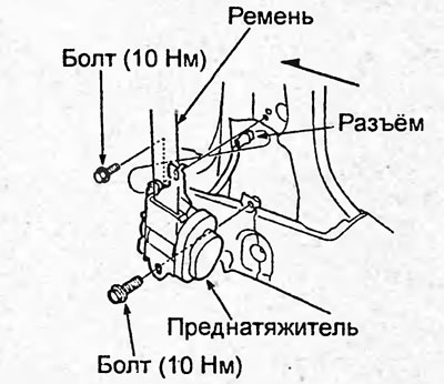 7. Отсоедините разъём. Отверните болты крепления преднатяжителя ремня безопасности и затем снимите ремень безопасности и преднатяжитель.