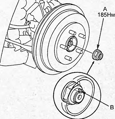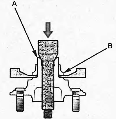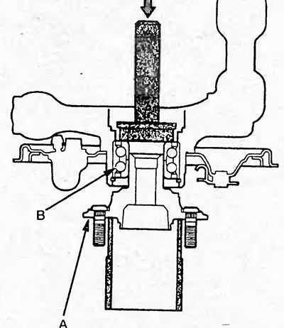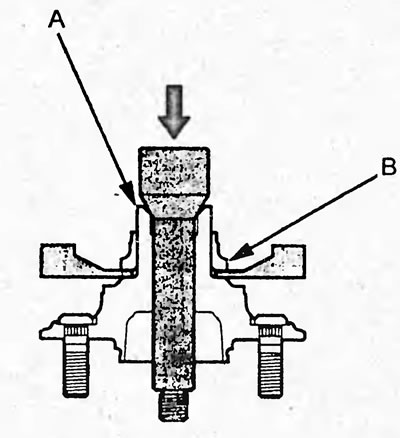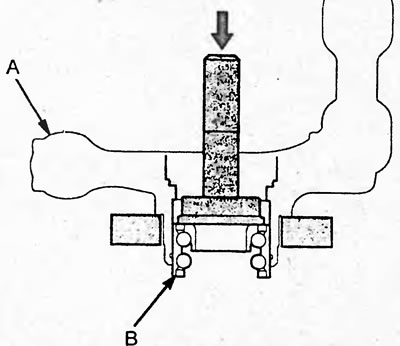 Примечание: если внутреннее кольцо (В) подшипника осталось на ступице (А), то при помощи спецприспособлений и пресса снимите кольцо со ступицы.