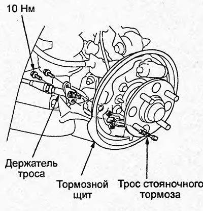 5. Отверните болты и снимите трос и держатель троса стояночного тормоза.