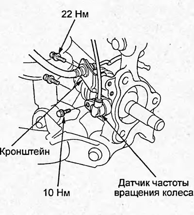 8. (Седан) Отверните болты и снимите кронштейн тормозного шланга и датчик частоты вращения колеса.