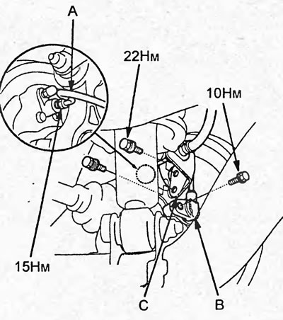 10. (Хэтчбек) Отверните болты и снимите кронштейн (С) тормозной трубки и датчик (В) частоты вращения колеса.