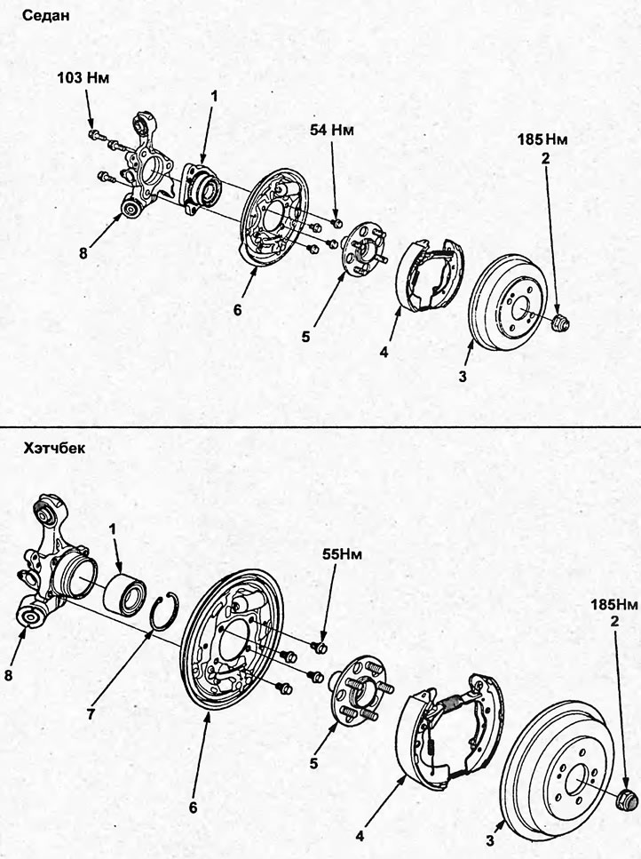 Снятие и установка ступицы заднего колеса (модели 4WD). 1 - подшипник, 2 - гайка, 3 - тормозной барабан, 4 - тормозные колодки, 5 - ступица, 6 - тормозной щит, 7 - стопорное кольцо, 8 - держатель подшипника.