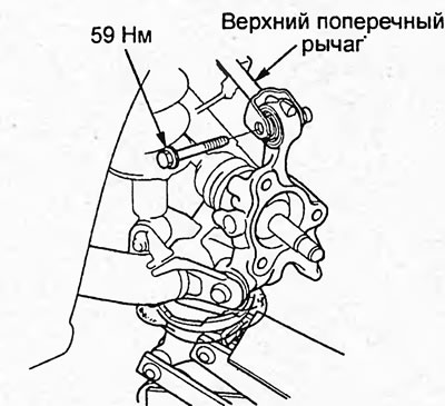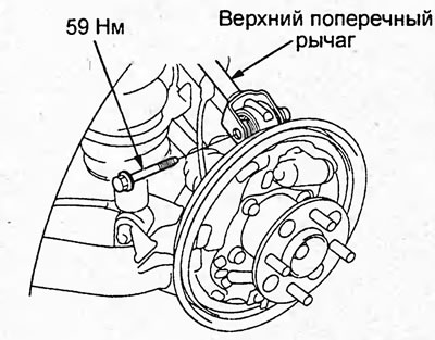 11. Поддомкратьте продольный рычаг, отверните болт и отсоедините верхний поперечный рычаг от держателя подшипника.