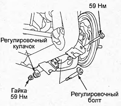- проверьте и, при необходимости, отрегулируйте углы установки задних колес;