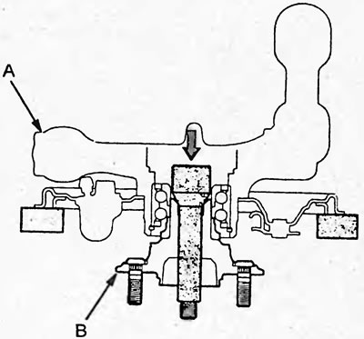 2. При помощи пресса и оправки вы-прессуйте ступицу (В) из держателя подшипника (А).
