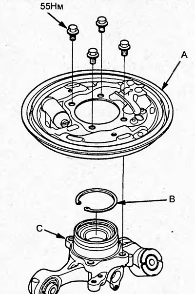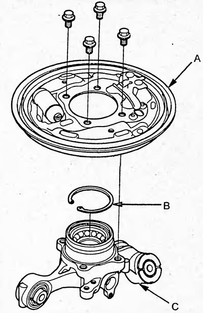 3. Отверните болты и снимите тормозной щит (А) с держателя подшипника (С).