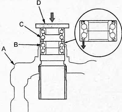 6. Установите новый подшипник (В), как показано на рисунке, и при помощи старого подшипника (С) и стальной пластины (D) запрессуйте новый подшипник в держатель подшипника (А).
