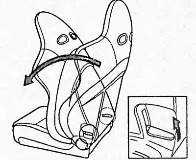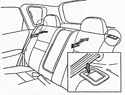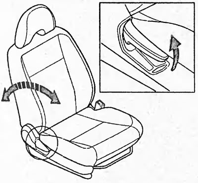 Седан, хэчбек (пятидверные модели) Для изменения угла наклона спинки сиденья наклонитесь слегка вперед, потяните вверх рычажок блокировки спинки сиденья, затем отклонитесь назад в требуемое положение и отпустите рычажок. Спинка сиденья зафиксируется в этом положении.