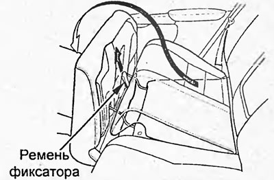 а) Потянув за ремень фиксатора, поднимите подушку сиденья, как показано на рисунке.