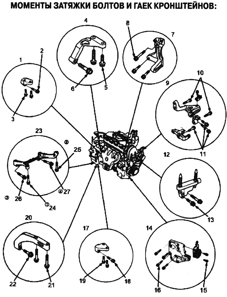 1. задний элемент жесткости; 2. 10х1,25 мм, 44 nm (4,5 кгс/м); 3. 8x1,25 мм, 24 nm (2,4 кгс/м); 4. задний элемент жесткости; 5. 8x1,25 мм, 24 nm (2,4 кгс/м); 6. 10х1,25 мм, 44 nm (4,5 кгс/м); 7. кронштейн насоса гидроусилителя; 8. 10х1,25 мм, 44 nm (4,5 кгс/м); 9. кронштейн генератора; 10. 10х1,25 мм, 44 nm (4,5 кгс/м); 11. 10х1,25 мм, 44 nm (4,5 кгс/м); 12. кронштейн боковой опоры двигателя; 13. 10x1,25 мм, 54 nm (5,5 кгс/м); 14. кронштейн компрессора кондиционера; 15. 8x1,25 мм, 24 nm (2,4 кгс/м); 16. 10х1,25 мм, 44 nm (4,5 кгс/м); 17. передний элемент жесткости; 18. 10х1,25 мм, 44 nm (4,5 кгс/м); 19. 8х1,25 мм, 24 nm (2,4 кгс/м); 20. передний элемент жесткости; 21. 8х1,25 мм, 24 nm (2,4 кгс/м); 22. 10x1,25 мм, 44 nm (4,5 кгс/м); 23.элемент жесткости. затягивайте болты на элементе жесткости в порядке, указанном цифрами на рисунке (24-27).; 24. 8х1,25 мм, 24 nm (2,4 кгс/м); 25. 8х1,25 мм, 24 nm (2,4 кгс/м); 26. 10x1,25 мм, 44 nm (4,5 кгс/м); 27. 10х1,25 мм, 44 nm (4,5 кгс/м)