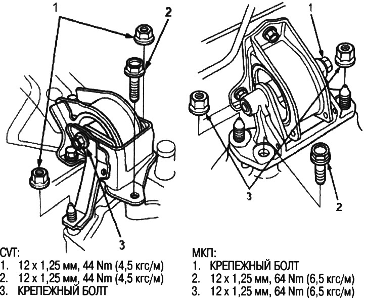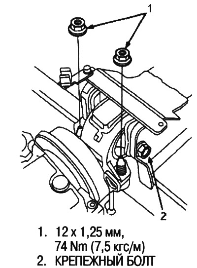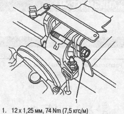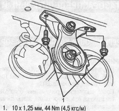 7. Затяните крепежные болты кронштейна левой передней опоры (рисунок в правой колонке вверху).