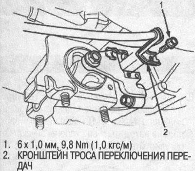 4. Установите кронштейн троса переключения передач на кронштейн задней опоры (CVT) (рисунок на соседней странице слева вверху).