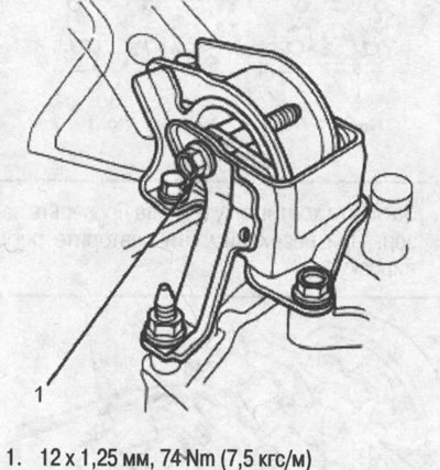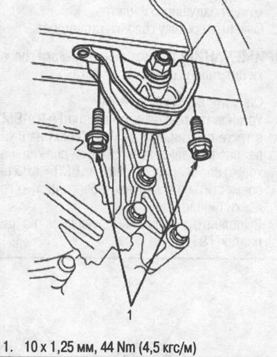 3. Затяните крепежные болты/гайки кронштейна опоры коробки передач, затем ослабьте крепежный болт.