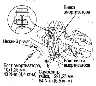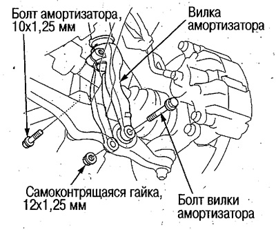 3. Открутите самоконтрящуюся гайку (12 мм), снимите болт вилки и снимите вилку амортизатора.