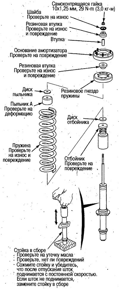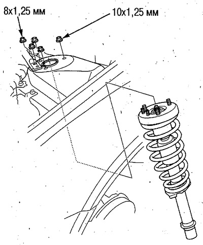 4. Открутите верхние гайки (8 мм) и (10 мм) и снимите амортизатор в сборе.
