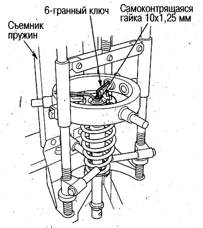 1. Установите амортизатор в сборе на съемник пружин и сожмите пружину. При помощи шестигранного ключа и специнструмента открутите самоконтрящуюся гайку.